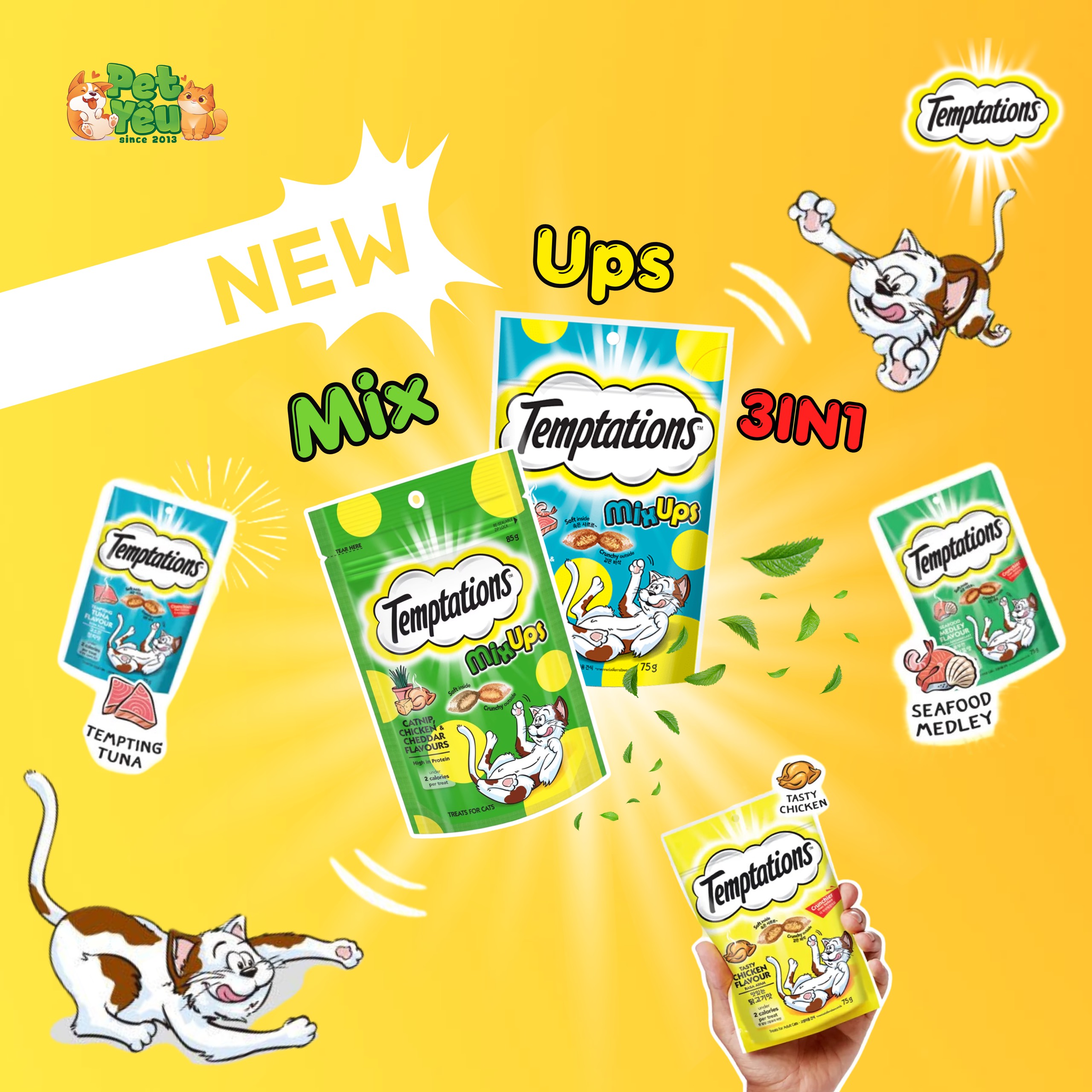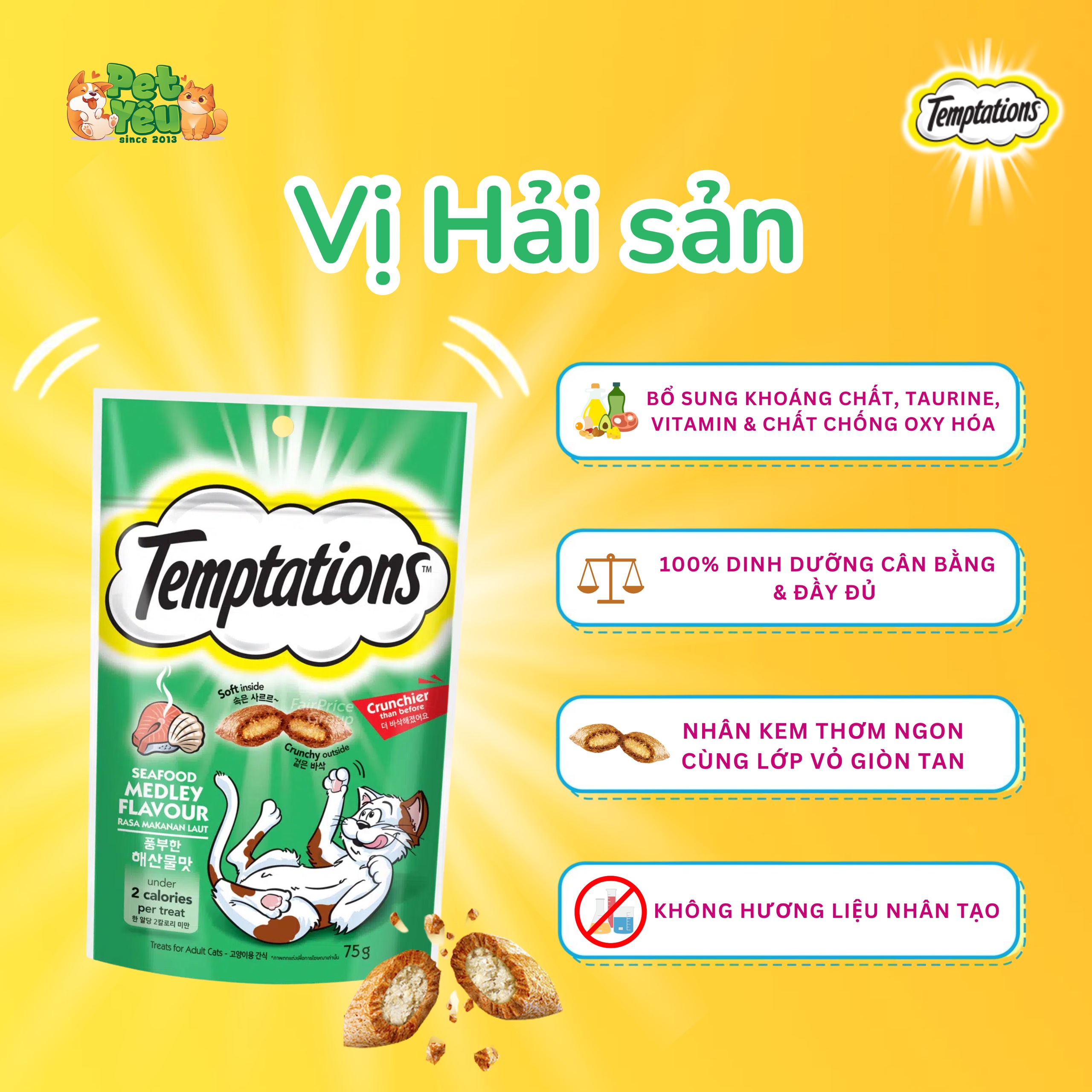 Giao hàng nhanh chóng- Bánh thưởng cho mèo Temptations - vị Hải Sản túi 75g