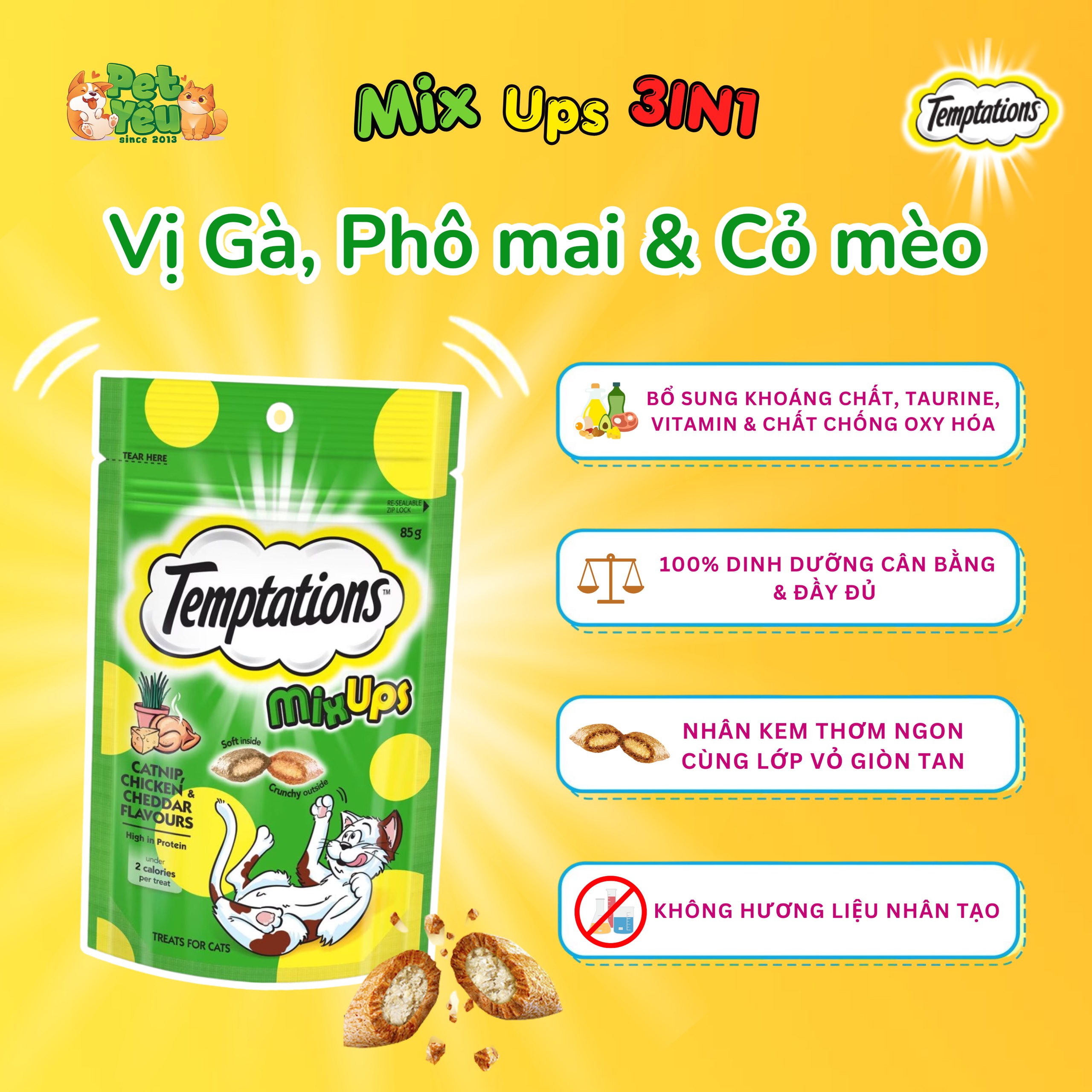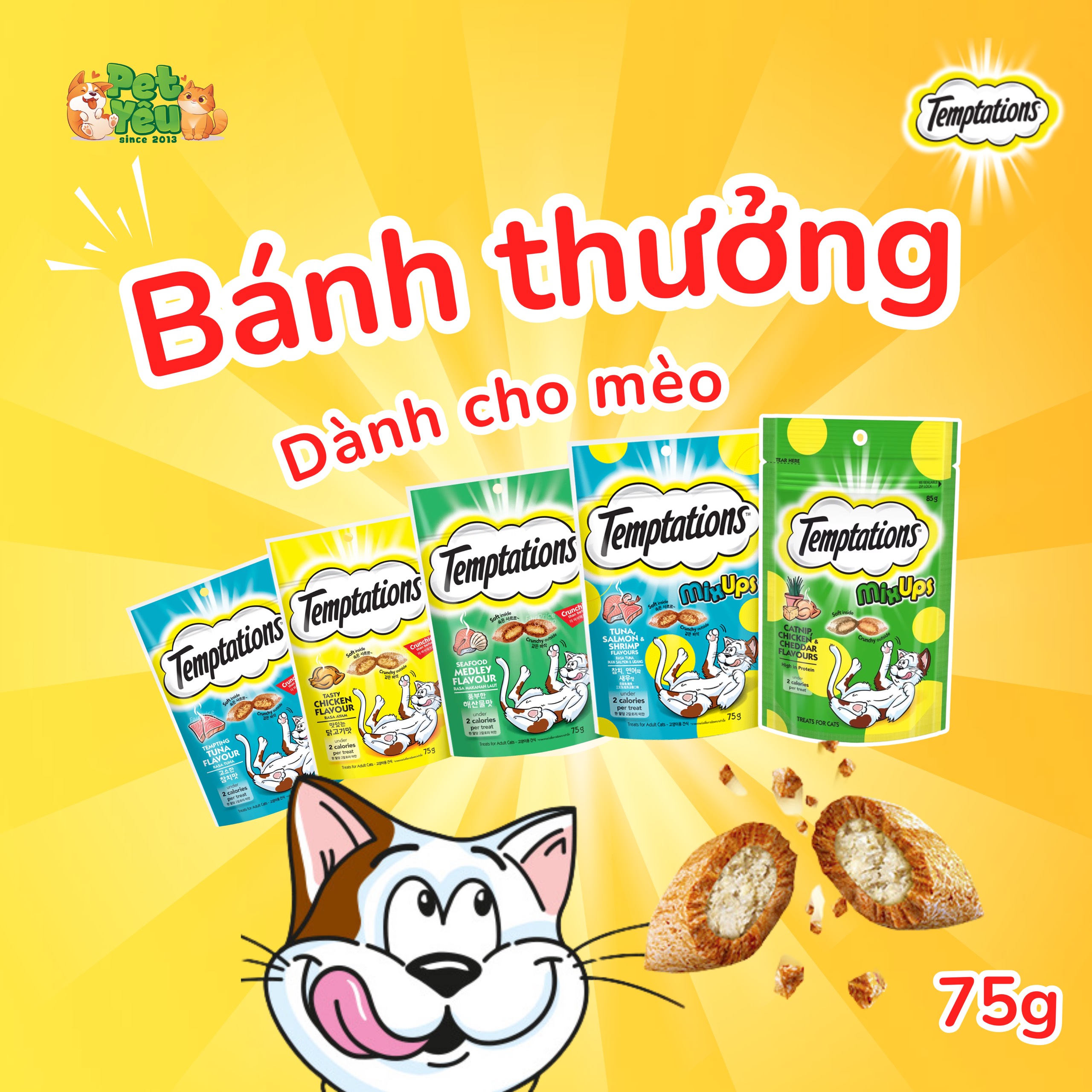 Giao hàng nhanh chóng- Bánh thưởng cho mèo Temptations - vị Thịt Gà, Phô Mai & Cỏ Mèo túi 75g
