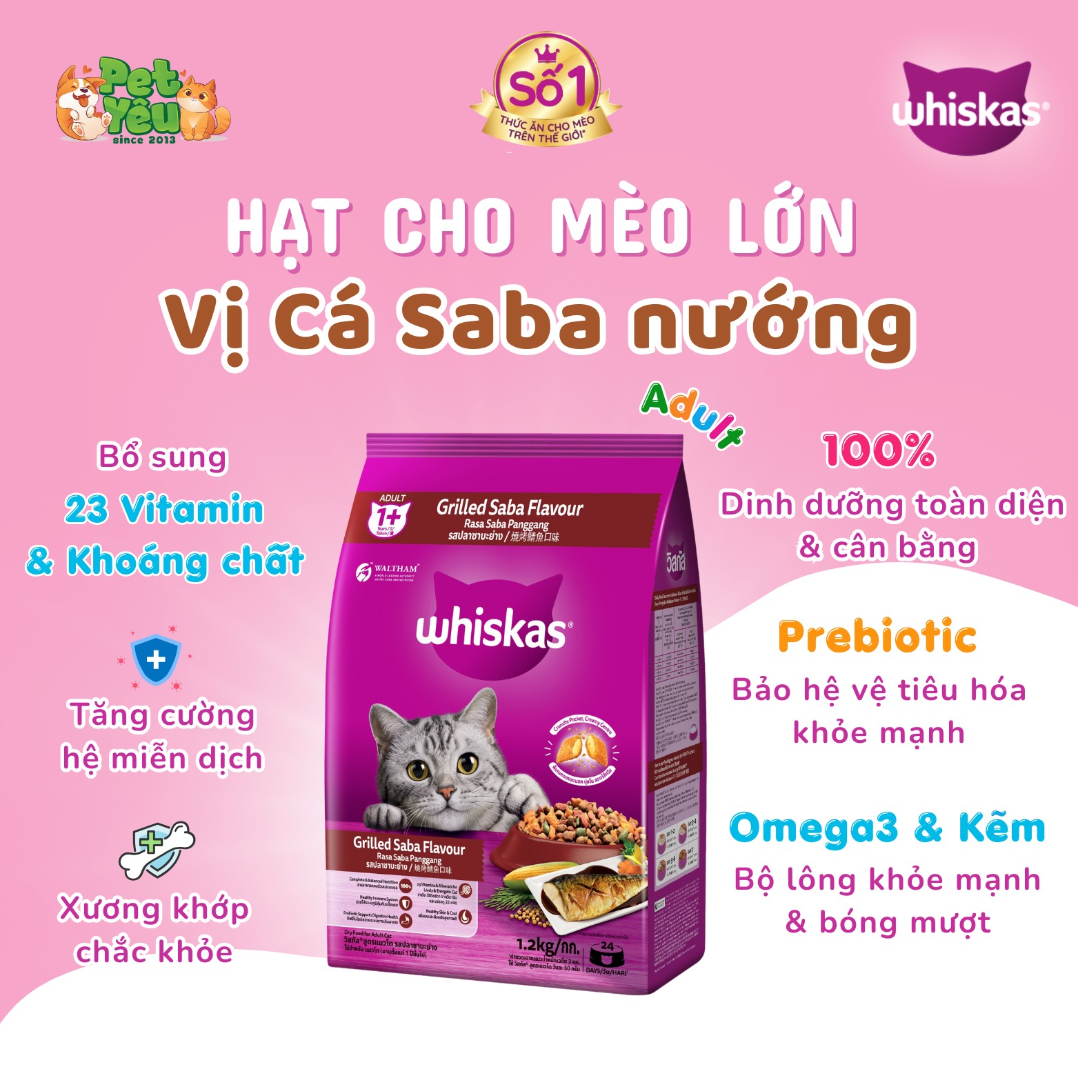 - Thức ăn cho mèo WHISKAS được chế biến đặc biệt với chất chống oxy hóa để hỗ trợ nhu cầu dinh dưỡng của mèo từ 1 tuổi trở lên, giúp mèo phát triển toàn diện