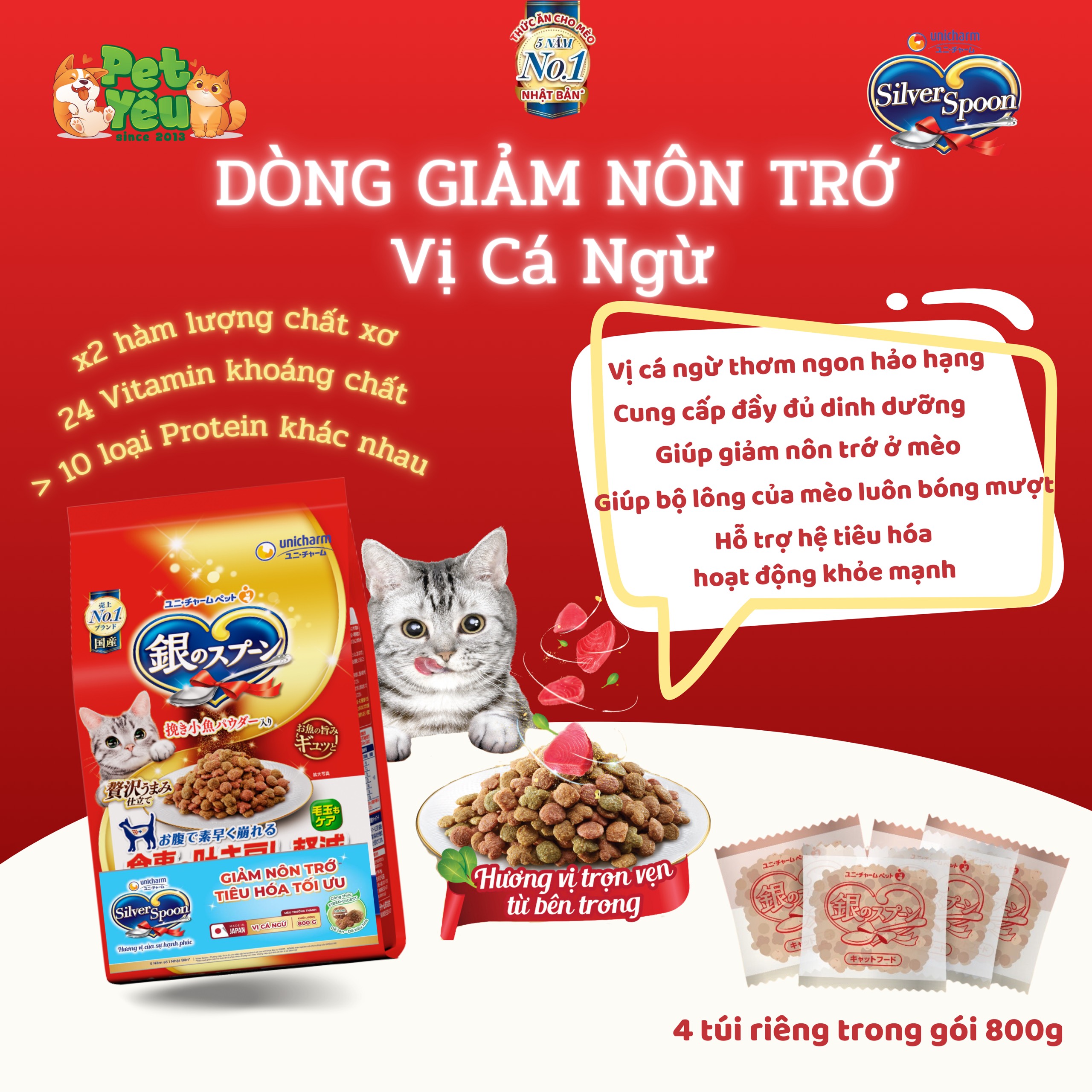 Giao hàng nhanh chóng- Hạt thức ăn cho mèo Silver Spoon - Dòng giảm nôn trớ - Vị Cá Ngừ 800gr