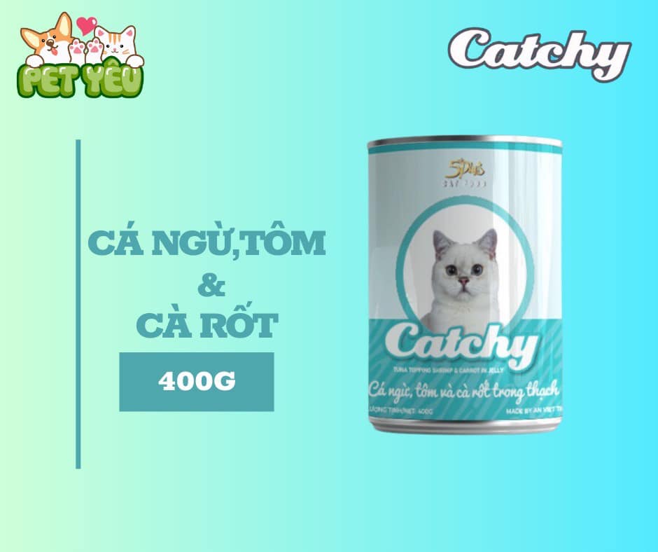 Giao hàng nhanh chóng- Pate cho mèo CATCHY lon 400gr - vị cá ngừ , tôm và cà rốt trong thạch