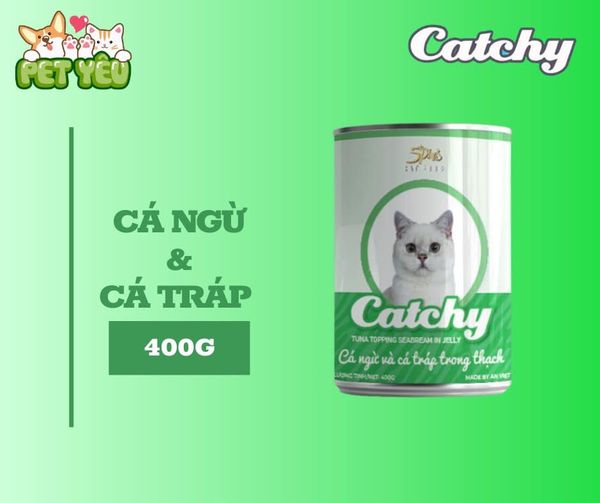 Giao hàng nhanh chóng- Pate cho mèo CATCHY lon 400gr - vị cá ngừ và cá tráp trong thạch