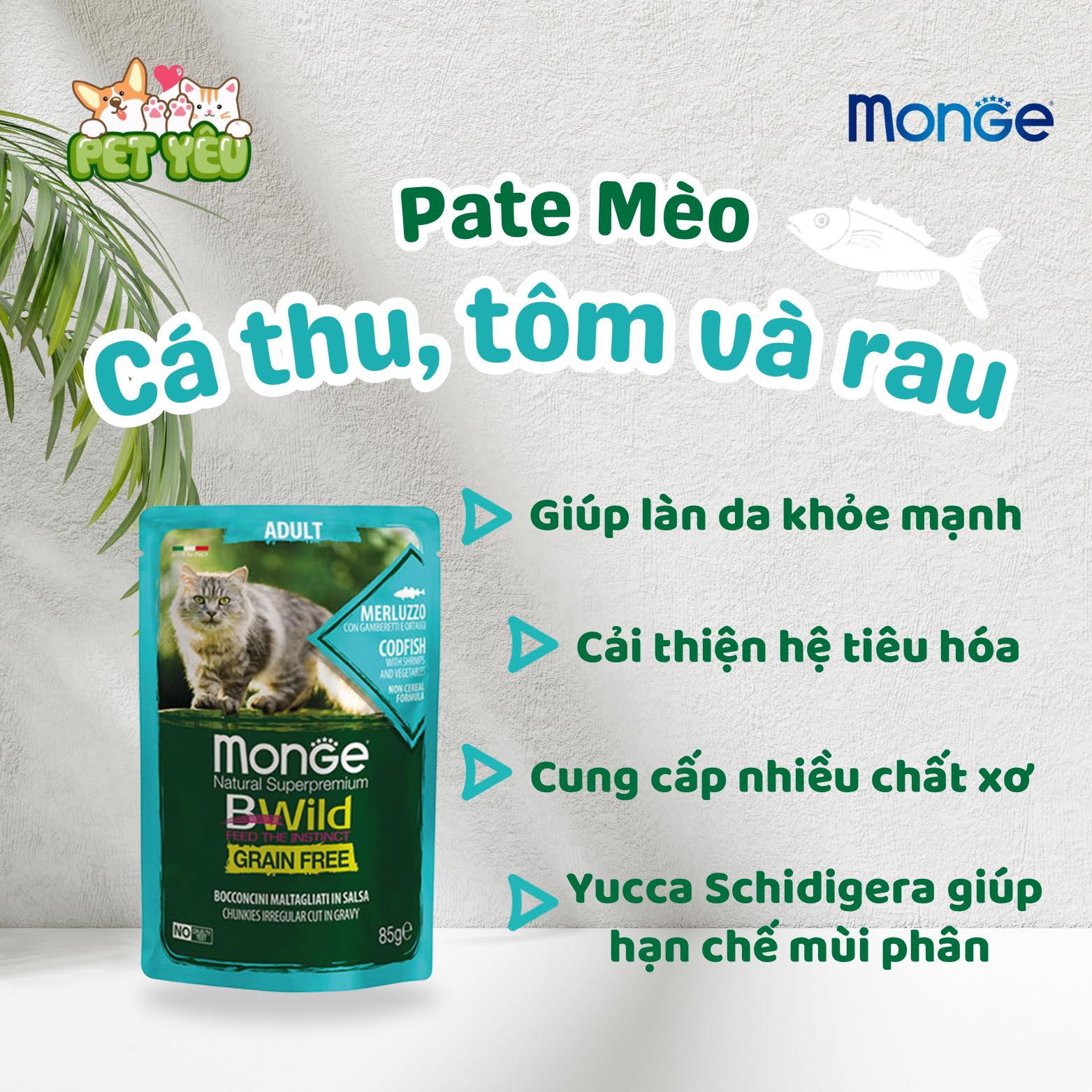 Giao hàng nhanh chóng- Pate mèo cao cấp Monge BWild Grain Free 85gr - vị CÁ THU, TÔM & RAU