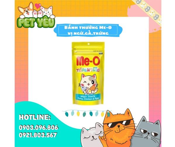 + Bánh thưởng cho mèo Me-O là dòng sản phẩm thức ăn cho mèo được sản xuất với mục đích huấn luyện loài mèo: huấn luyện mèo nghe lời, huấn luyện đi vệ sinh đúng chỗ.