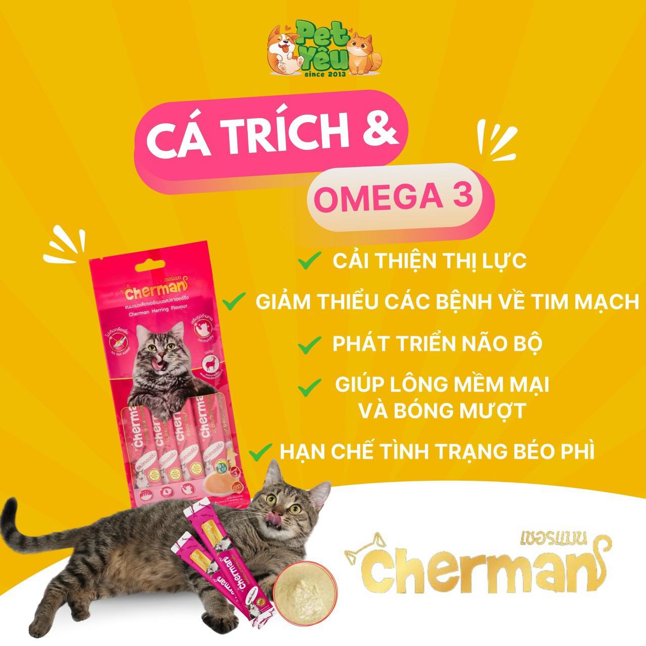 Súp thưởng Cherman còn bổ sung Omega 3 - giúp lông mềm mại và bóng mượt