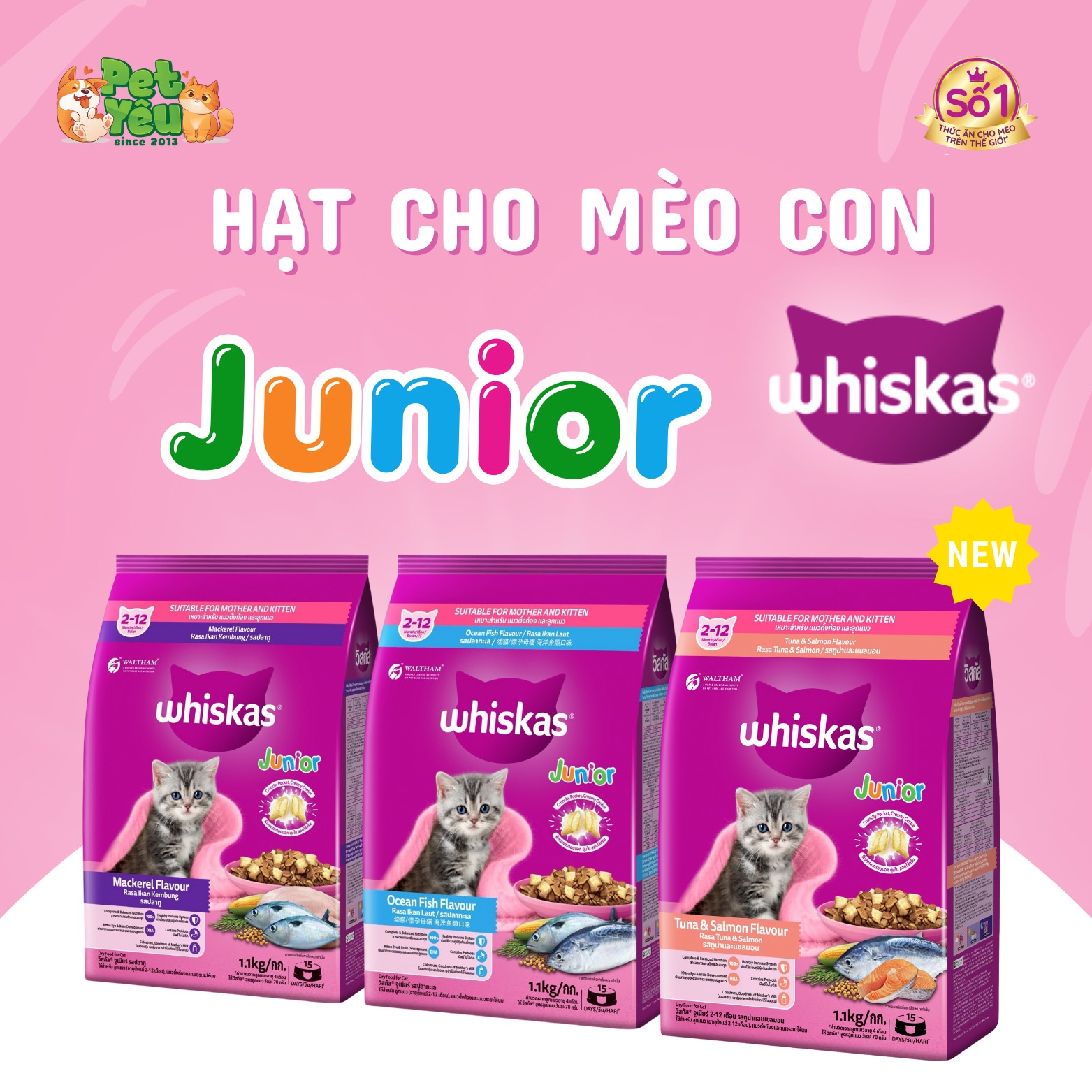 - Thức ăn cho mèo con WHISKAS® Junior được chế biến tỉ mỉ để đáp ứng nhu cầu dinh dưỡng đặc biệt của mèo con đang phát triển. Công thức của chúng tôi được bổ sung 41 chất dinh dưỡng thiết yếu, bao gồm DHA và sữa non, cung cấp cho mèo con của bạn sự khởi đầu tốt nhất có thể trong cuộc sống.