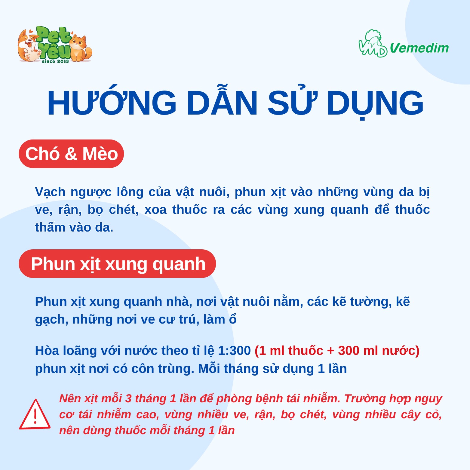 – Xịt khu vực chuồng nuôi, nệm nằm, chân tường để diệt ấu trùng, trứng ve, bọ chét, gián, mối,..