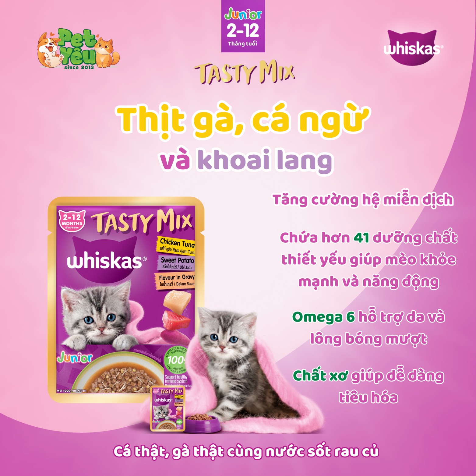 - Sự kết hợp hấp dẫn từ thịt gà , cá ngừ và khoai lang trong dòng sản phẩm cân bằng, toàn diện mới của Whiskas® Tasty Mix chính là món ăn mà các bé luôn ao ước.
